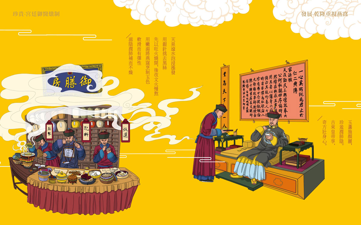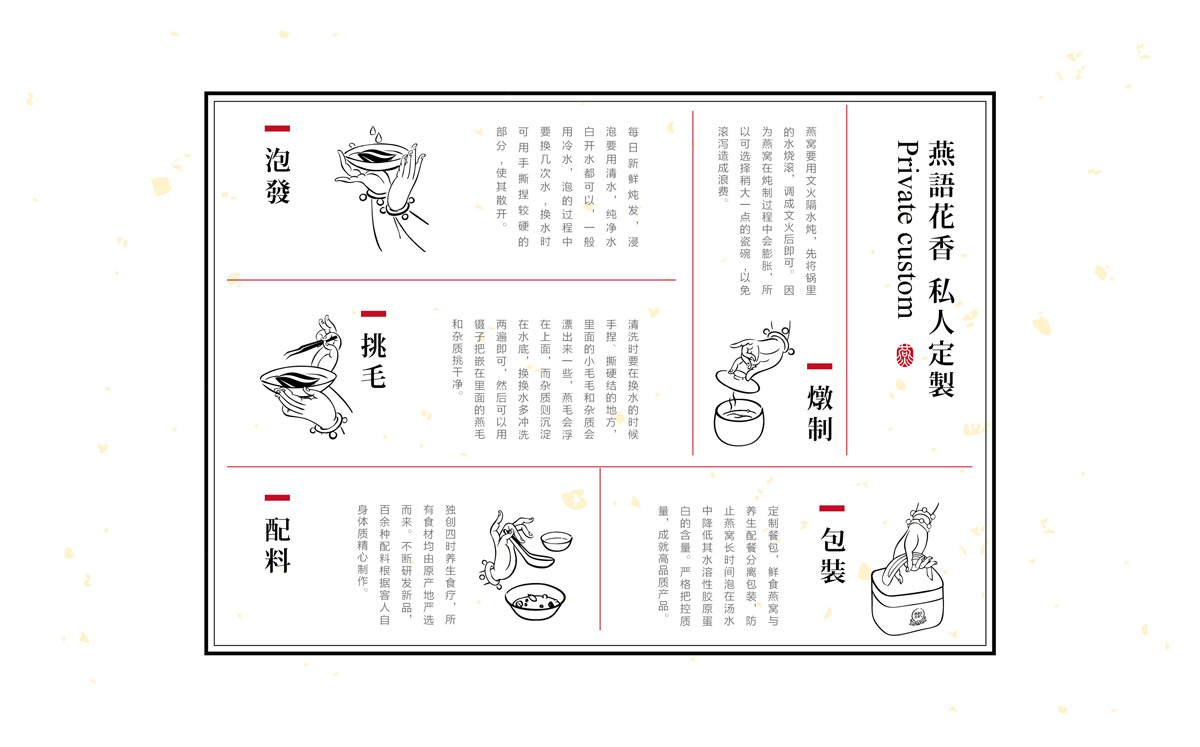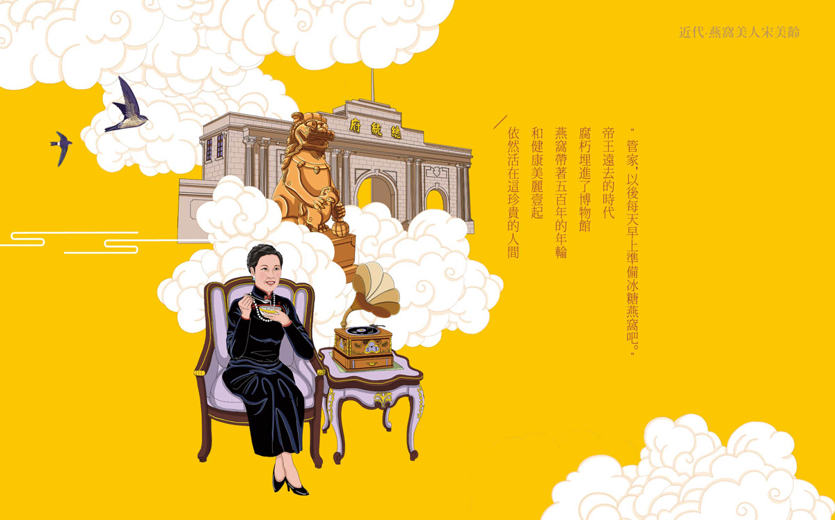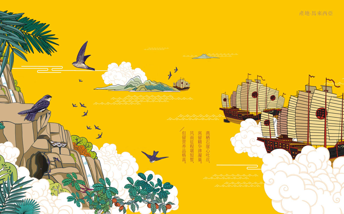 插畫生動描述著燕窩的歷史,自然風光和歷史風韻如在眼前,深化并豐富品牌內涵。歷時數月,團隊完成了燕語花香品牌系統性建設,包含品牌策劃、標志設計、VI系統設計、包裝設計、網站建設等一系列項目內容,實現了燕語花香全國范圍內統一的整體品牌形象升級。