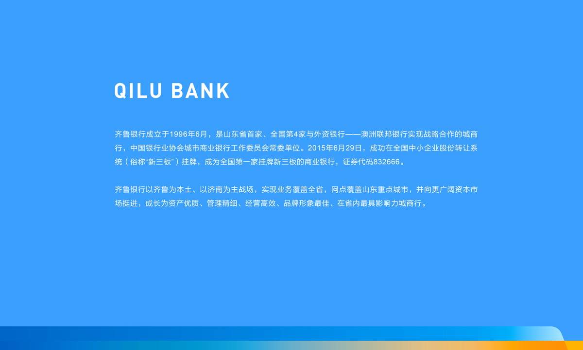 2015年齊魯銀行攜手海右博納,進(jìn)行了新三板上市品牌形象的全面升級打造,為齊魯銀行量身定制品牌全案解決方案,進(jìn)行了品牌標(biāo)志、VIS視覺系統(tǒng)、空間展廳等品牌全案整合服務(wù),深化品牌價(jià)值,使齊魯銀行的品牌形象達(dá)到最優(yōu)。