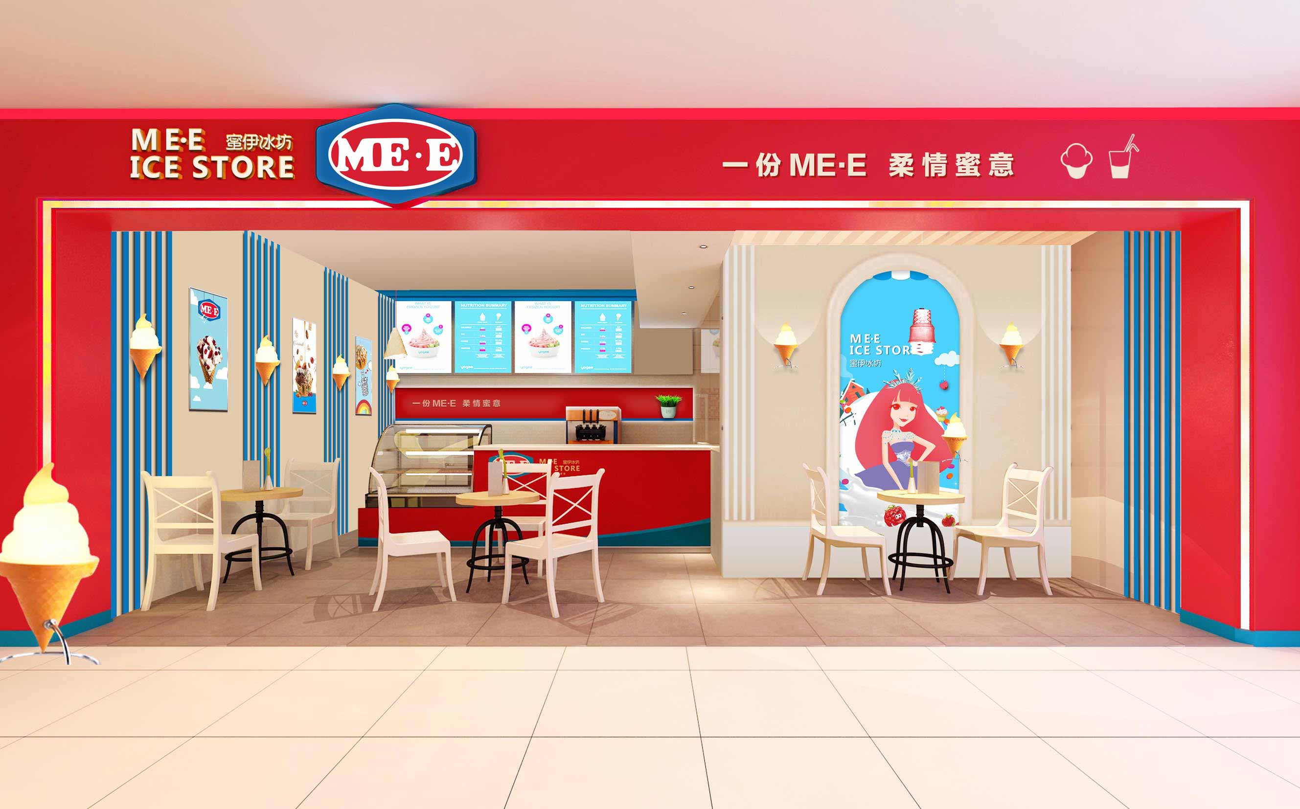 海右博納品牌整合團隊對蜜伊進行了空間SI、VI視覺系統等品牌的全案整合服務,進而使其店內環境時尚甜美,文化生動有趣,產品清晰自然。在深化品牌價值的同時,帶來品牌回響,為招商加盟奠定了堅實的基礎,確保蜜伊冰坊品牌成功騰躍。