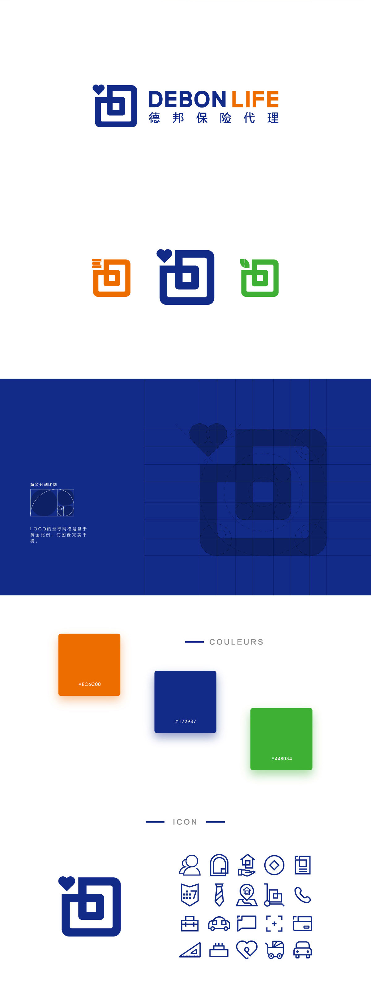 結合德鼎與德寧作為德邦保險的輔助分支所存在,海右博納最終為德邦提供以德邦保險為主導的系列企業標識。標識主體方圓結合,氣質穩重;左上部分打破整體感,意味人生難免會有不如意,但德邦保險將帶給人們保障。我們在德邦保險LOGO上,顏色使用藍色,使其代表的沉穩理性,帶給客戶可信任的心理暗示。在德鼎教育與德寧健康分別應用奉獻紅與健康綠,以對應其行業屬性。